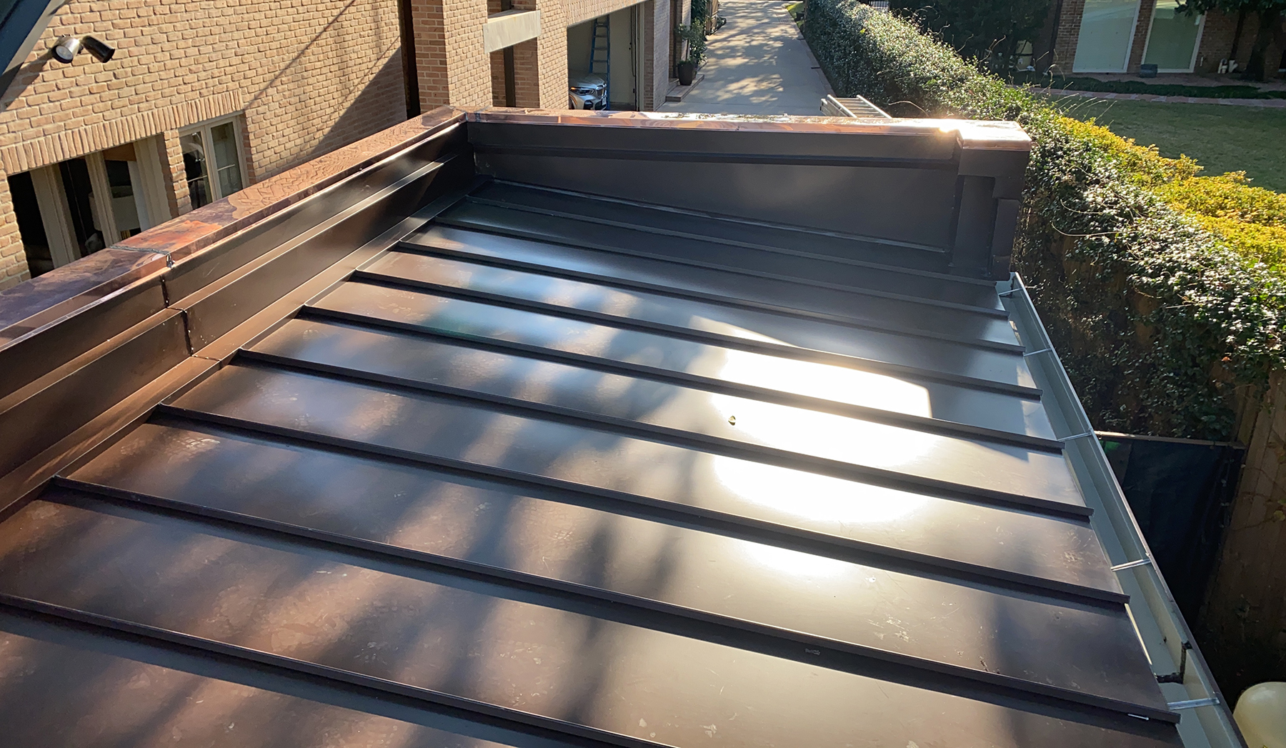 Sheetmetal roofing is the choice of many architects and designers, whether for a traditional or a contemporary home. Standing seam sheetmetal roofing is energy efficient and easy to maintain. At Tile Roofs of Texas, we custom manufacture every sheetmetal roof in our own shop, to our own exacting standards. A wide variety of colors and materials are available including copper, zinc, lead-coated copper and zinc-coated copper to the more traditional galvanized and pre-painted materials. Please see our gallery for examples of this roofing option.